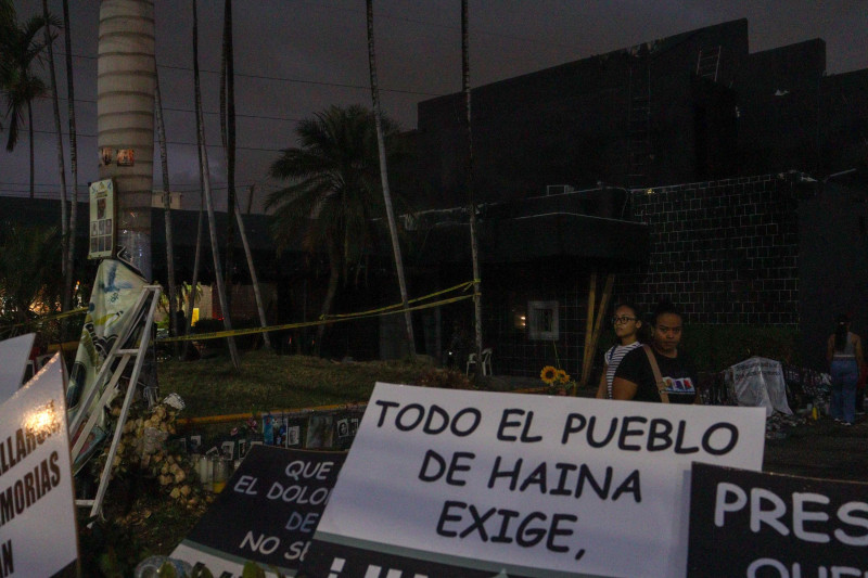 Velones, pancartas exigiendo justicia (“Presidente Abinader NO TE METAS”), banderas de República Dominicana y de Venezuela, fotos de las más de las 230 personas, aseguran muchos, que perecieron y 186 heridas tras derrumbarse el techo del establecimiento.