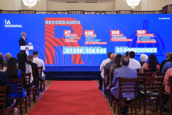 El presidente Luis Abinader recordó que ha habido 47 denuncias remitidas al Ministerio Público por la DIGEID, 426 informes remitidos al PEPCA por la Unidad Antifraude de la Contraloría y 108 procesos cancelados por Compras y Contrataciones.