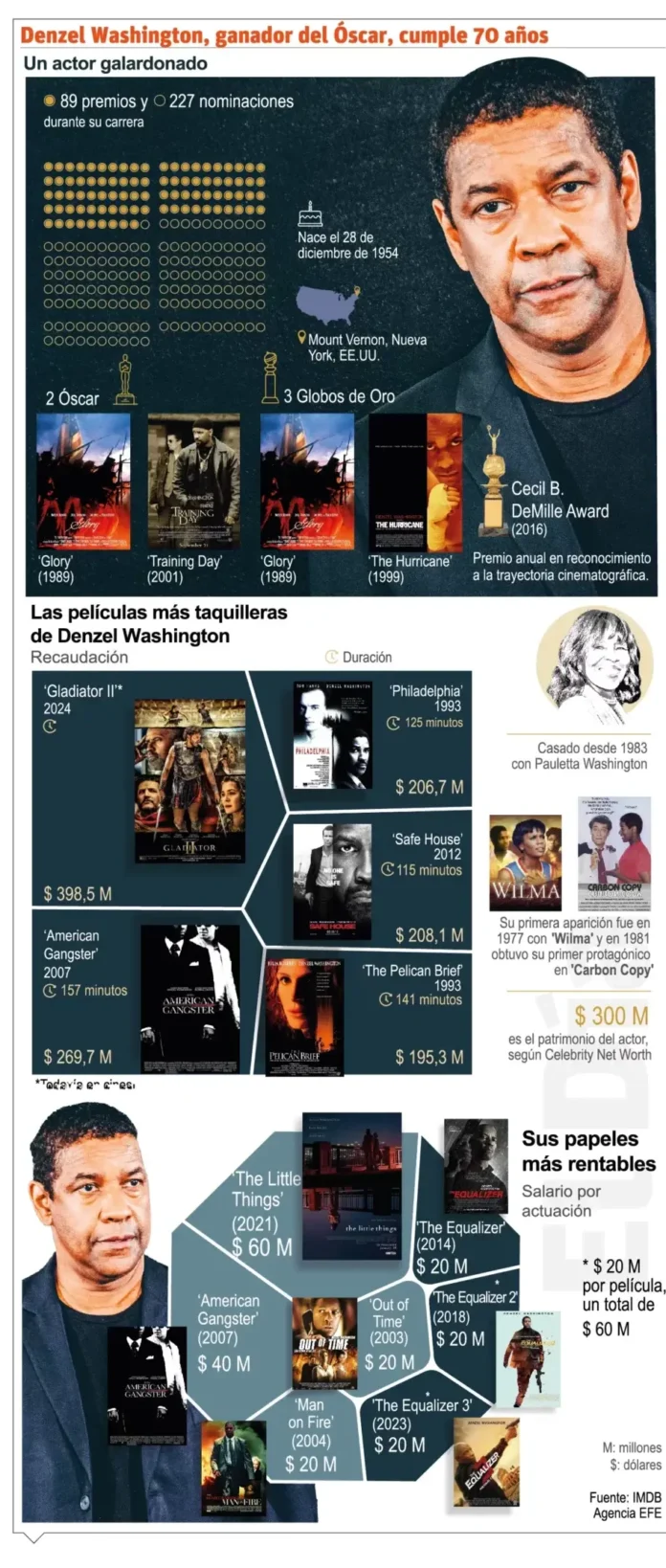 Nominado recientemente a los Premios Globo de Oro 2025 por su actuación en ‘Gladiator 2’ (Gladiador 2), el actor cumple setenta años destacándose por sus papeles en películas de drama y acción.