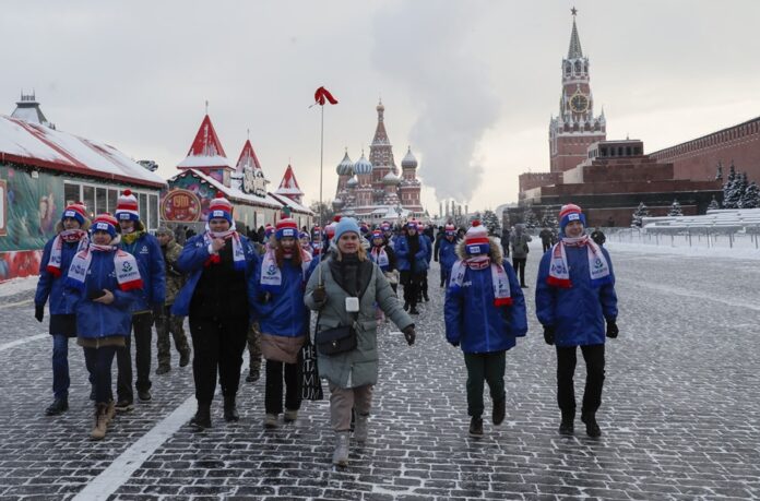 Moscow (Russian Federation), 07/12/2023.- People walk on the Red Square in front of the St. Basil Cathedral, Moscow Kremlin and Lenin's mausoleum in Moscow, Russia, 07 December 2023. The Federation Council adopted a resolution calling for a presidential election to be held on 17 March 2024. The banner reads 'Russians wake up! There is a national liberation war for the fatherland!'. (Rusia, Moscú) EFE/EPA/YURI KOCHETKOV