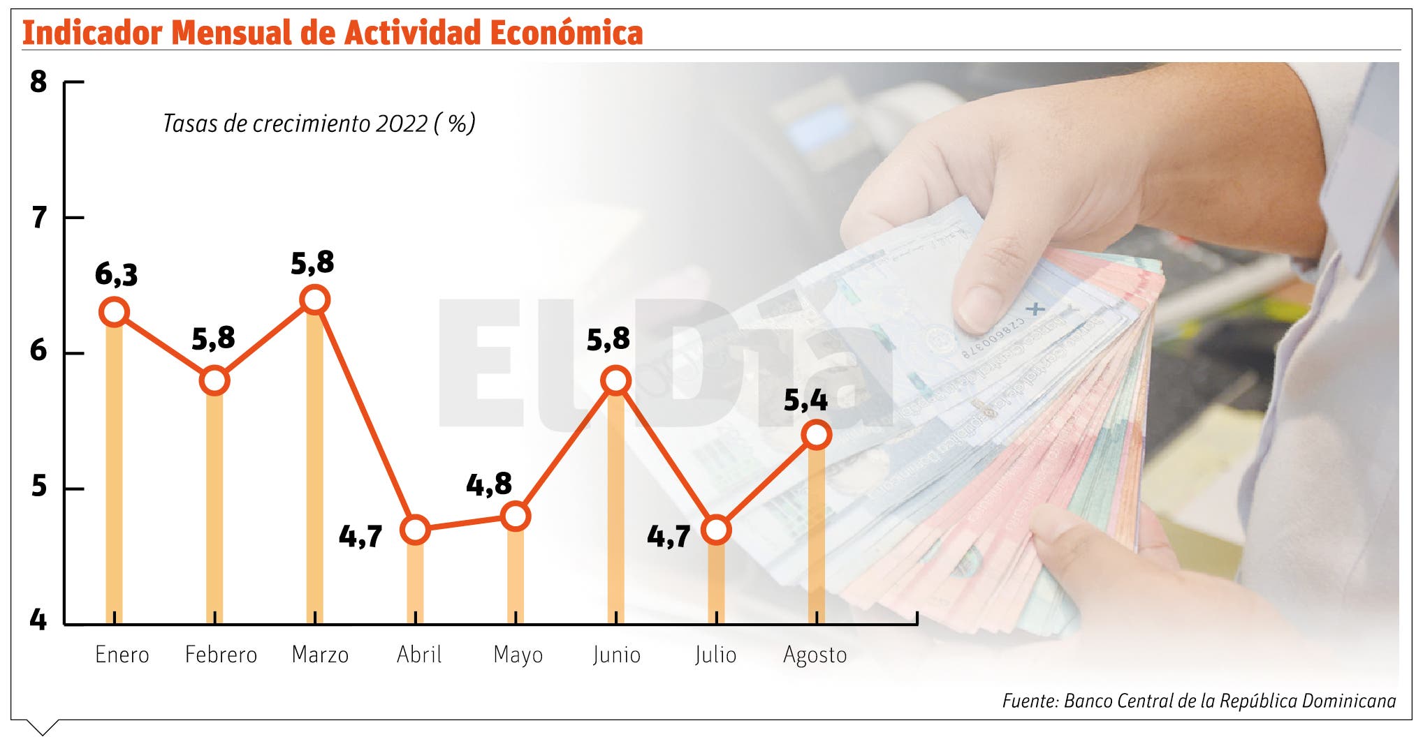 Santo Domingo.-El Indicador Mensual de Actividad Económica registró un crecimiento interanual acumulado de 5.5% en los primeros ocho meses de este año, de acuerdo con el informe preliminar presentado por el Banco Central.